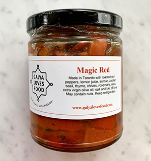 Made in Toronto with natural ingredients: Roasted red peppers, lemon juice, sumac, za’atar, basil, thyme, chives, rosemary, silan, extra virgin olive oil, salt and lots of love. May contain nuts. Keep refrigerated.